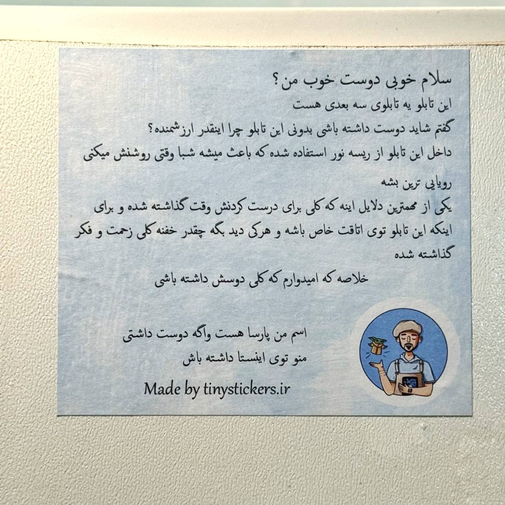 این تابلو سایزش 13 در 15 هست و داخلش از ریسه نور استفاده شده که با سه تا باتری میتونین توی شب یه فضای رویایی برای اتاقتون درست کنین